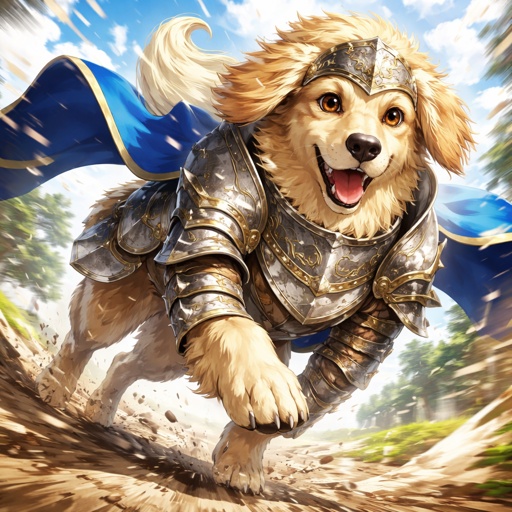 A golden retriever, the size of a horse dressed in Knights armour very noble and chivalrous looking