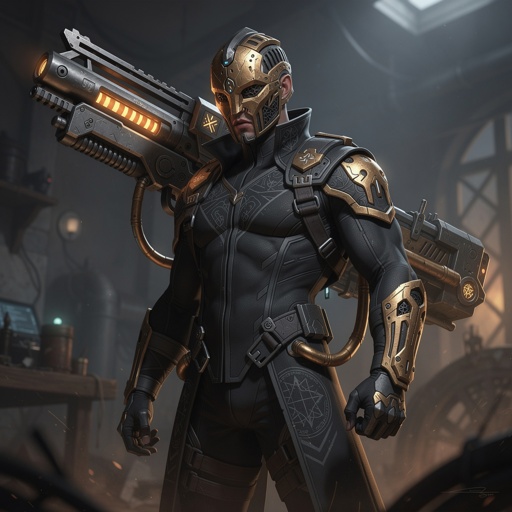 A warlock artificer wearing an innate black suit and an intricate bronze mask that covers his entire face except for his...
