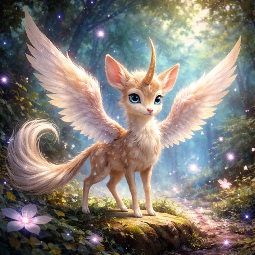 Small deer like creature with long tail tuft a small horn and it has big wings