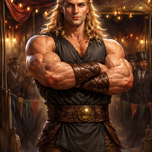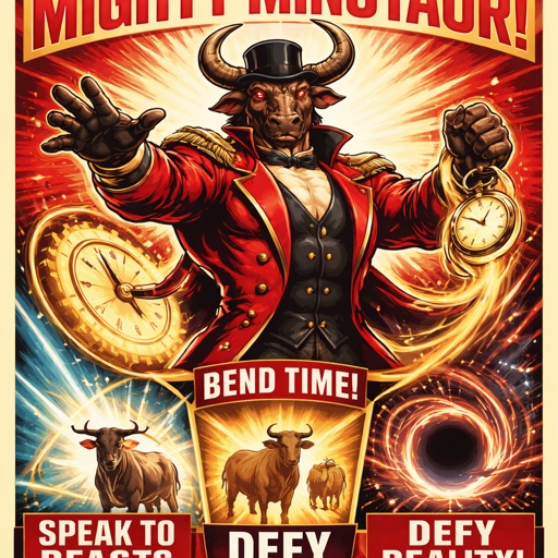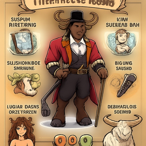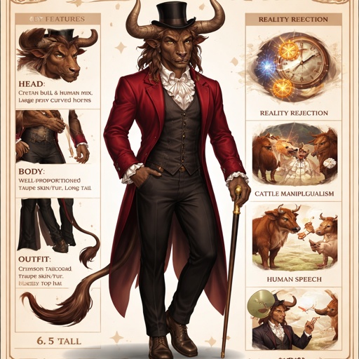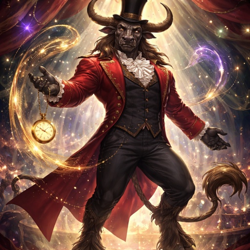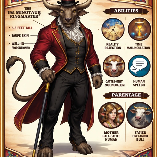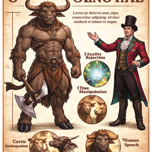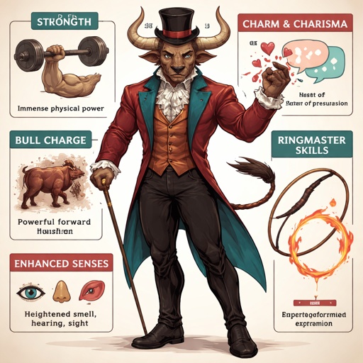 A Greta’s Minotaur with a well~proportioned figure that works at freak show as ringmaster. That has gifts/abilities like...