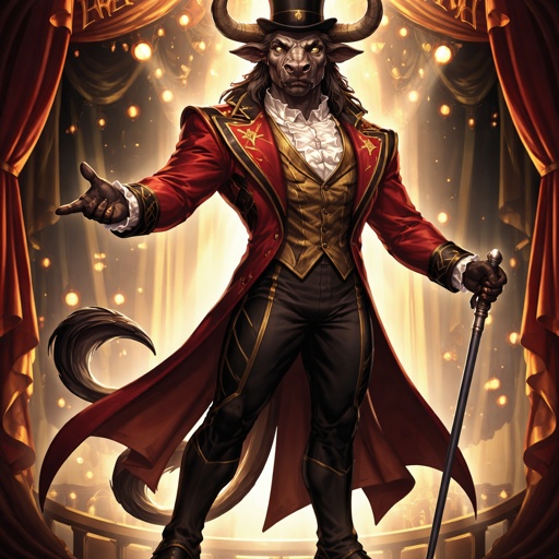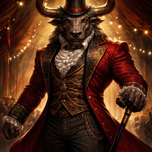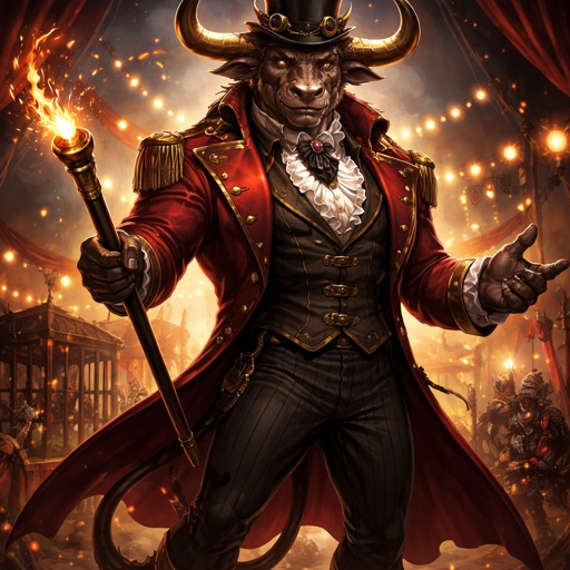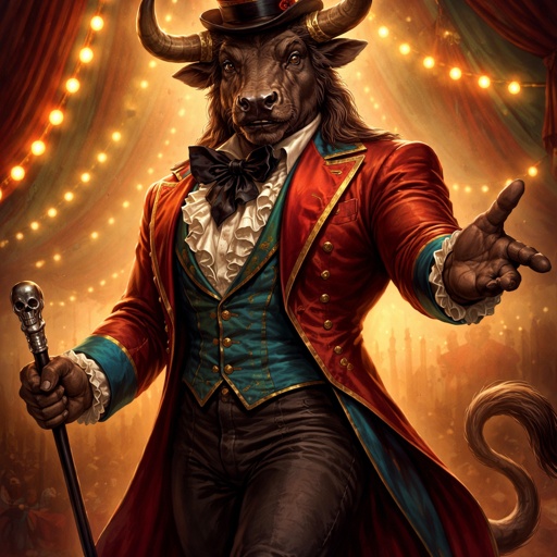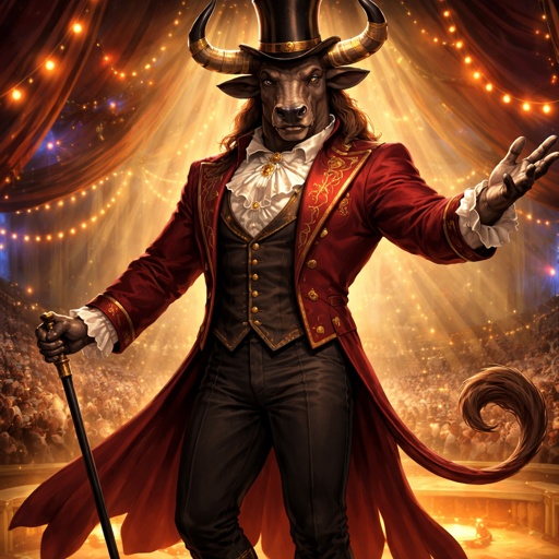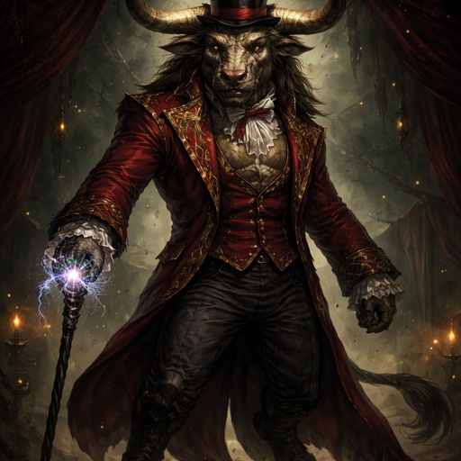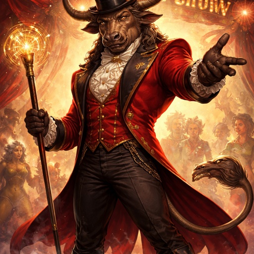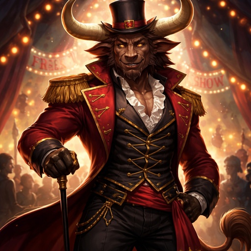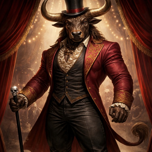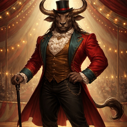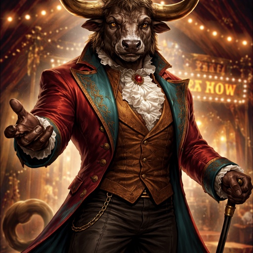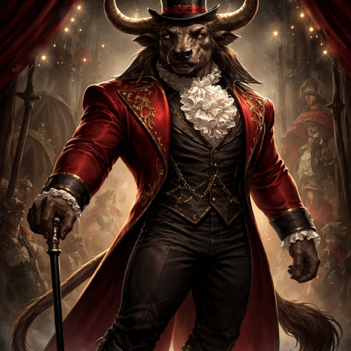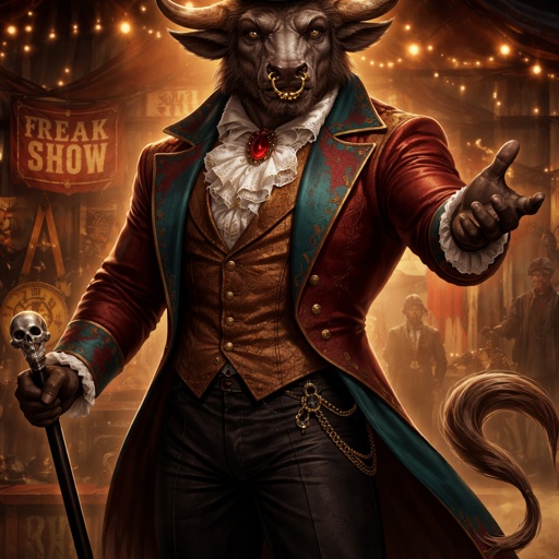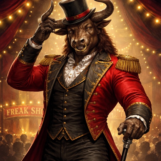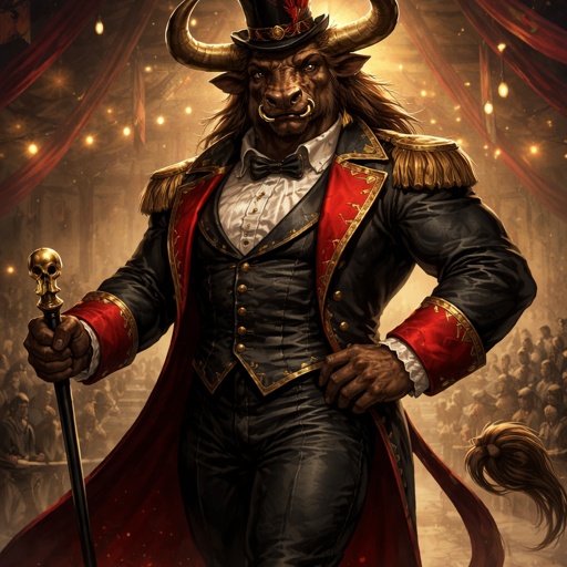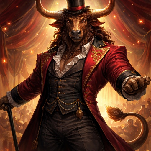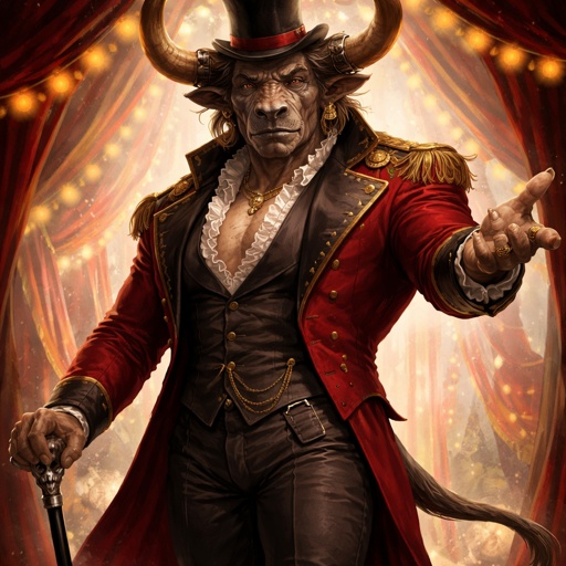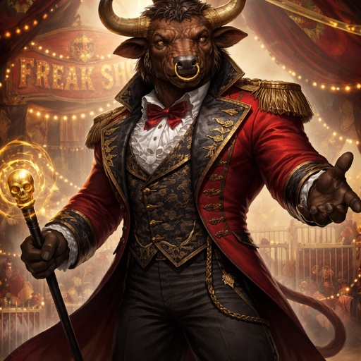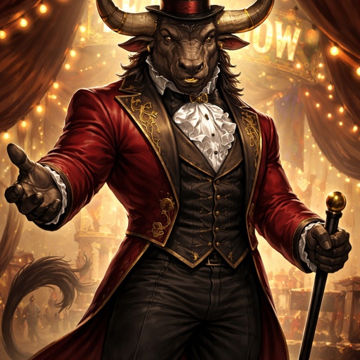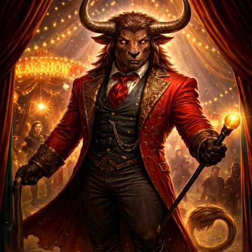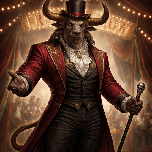A medium brown Steppe bull Minotaur with a well~proportioned figure that works at freak show as ringmaster. That has gif...