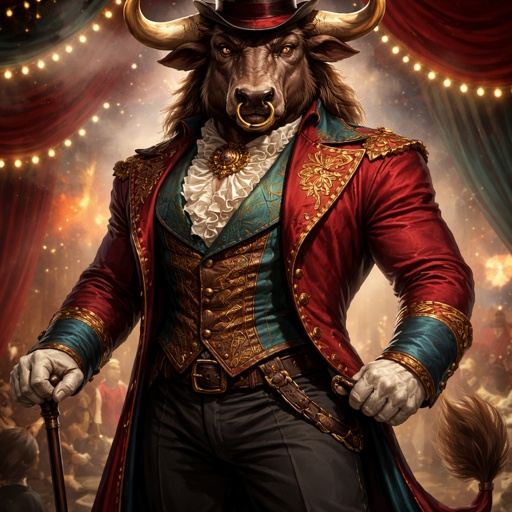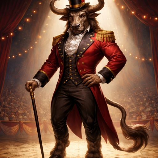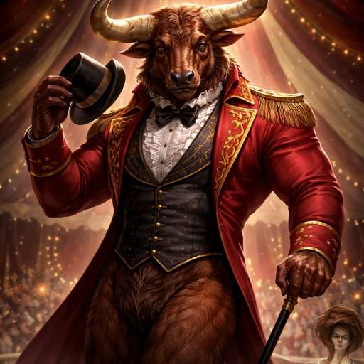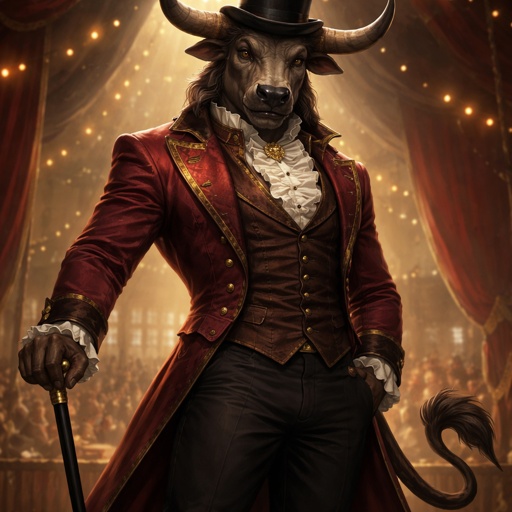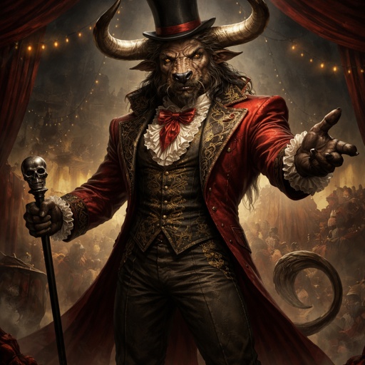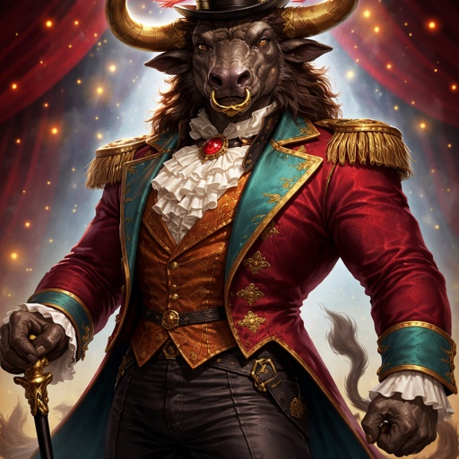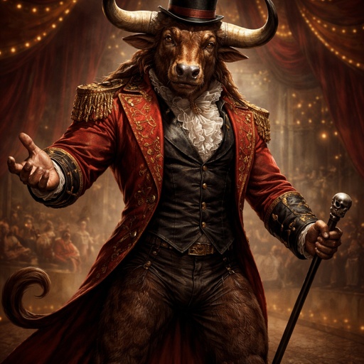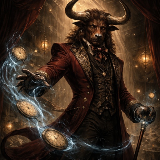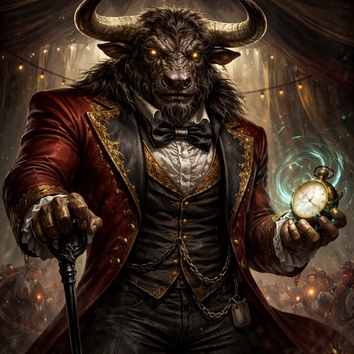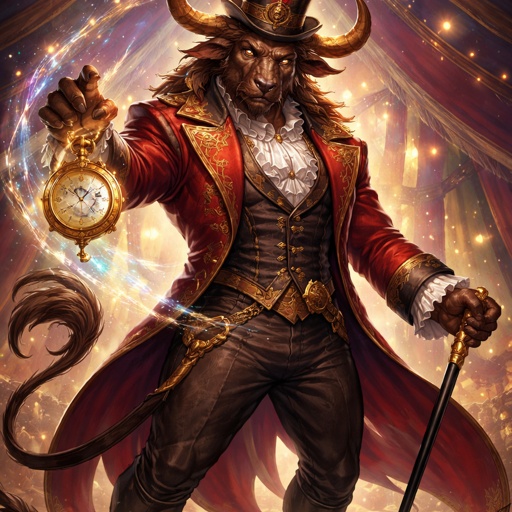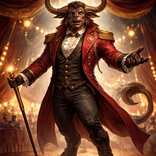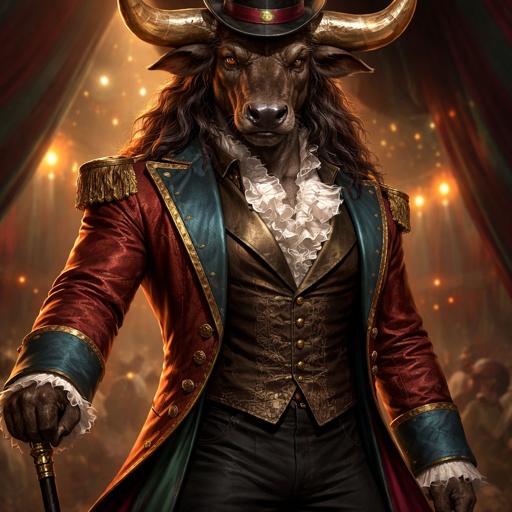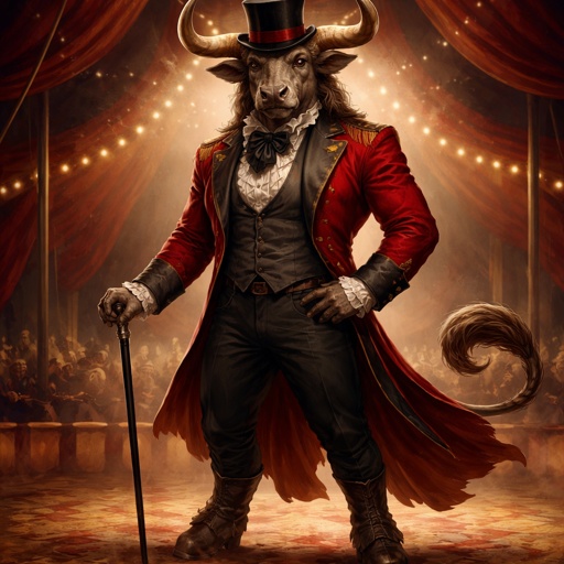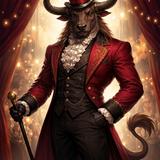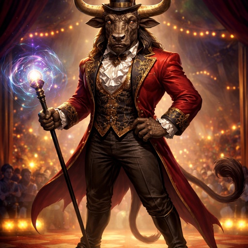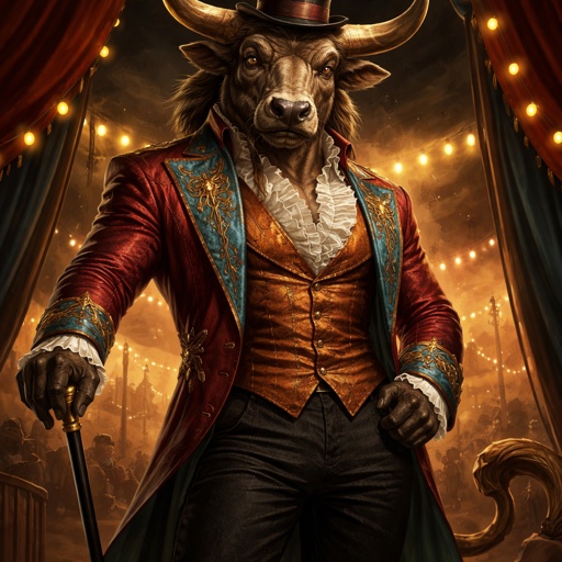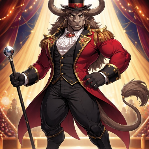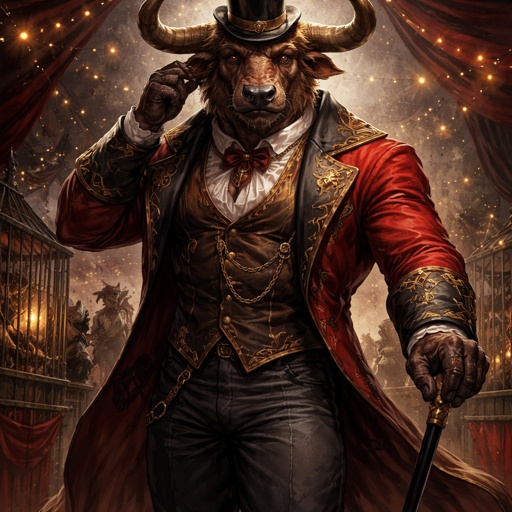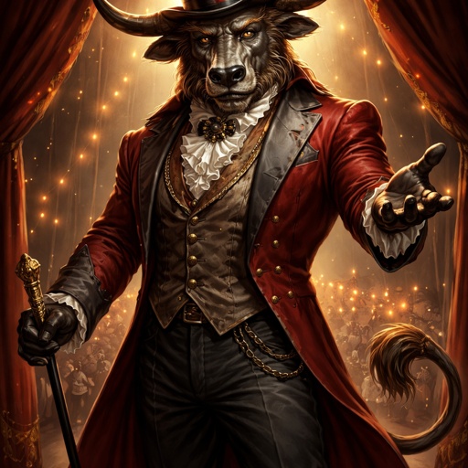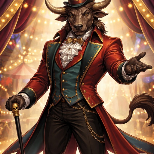 A medium brown Steppe bull Minotaur with a well~proportioned figure that works at freak show as ringmaster. That has gif...