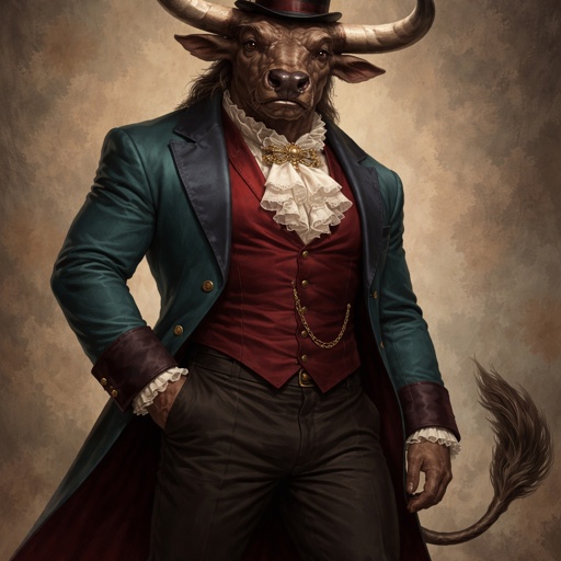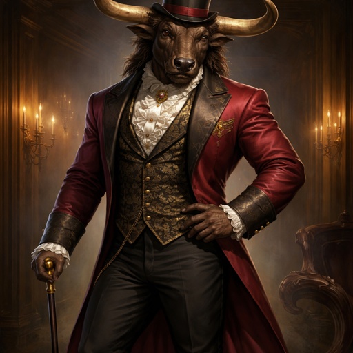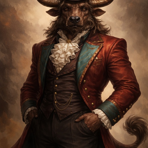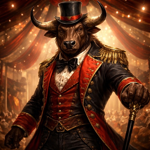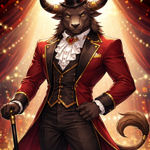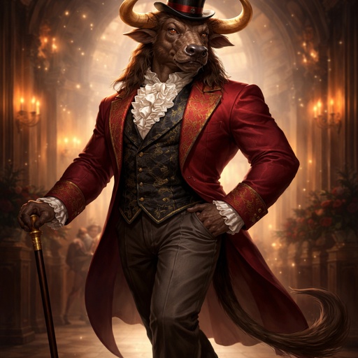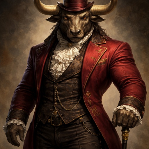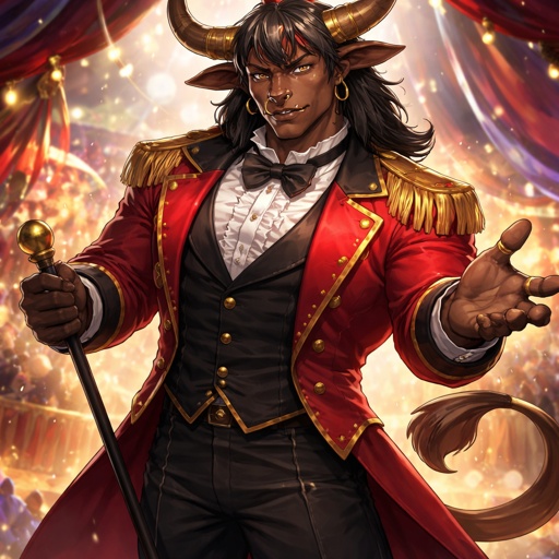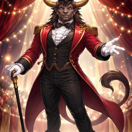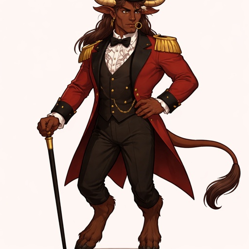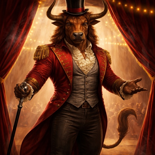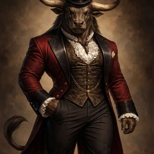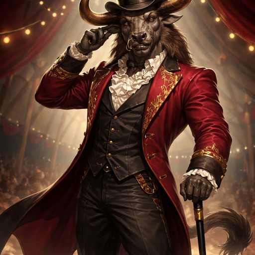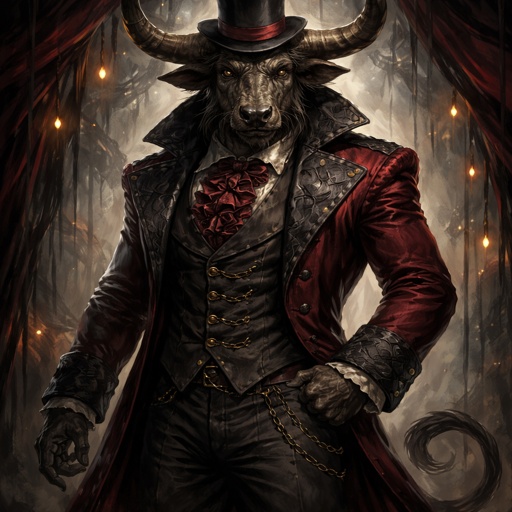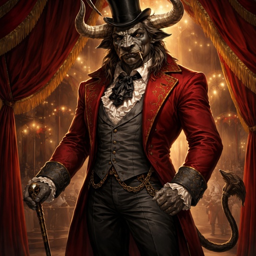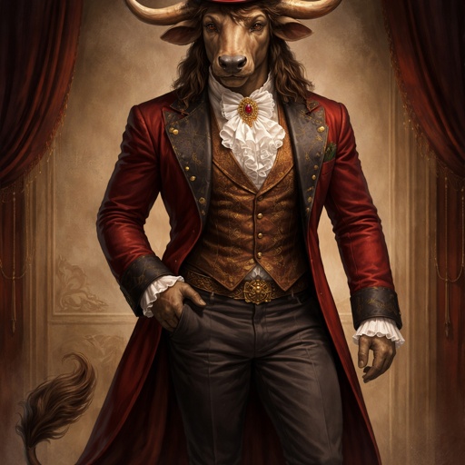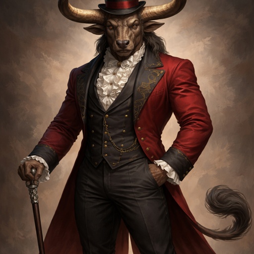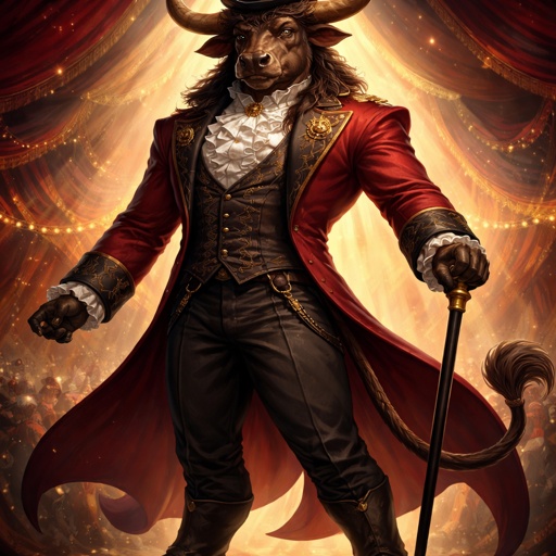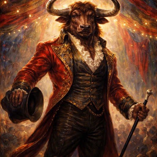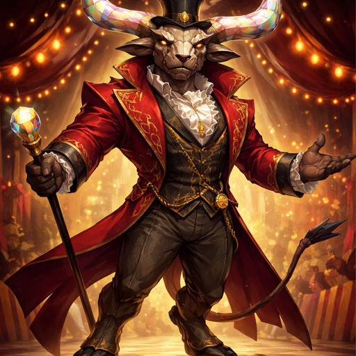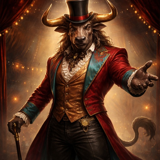 A medium brown Steppe bull Minotaur with a well~proportioned figure that works at freak show as ringmaster. That has gif...