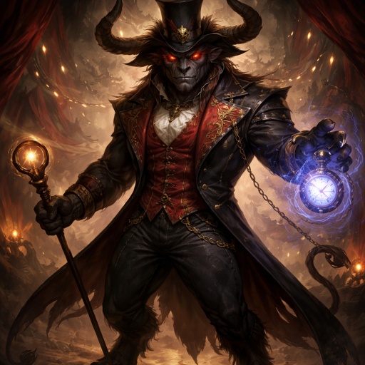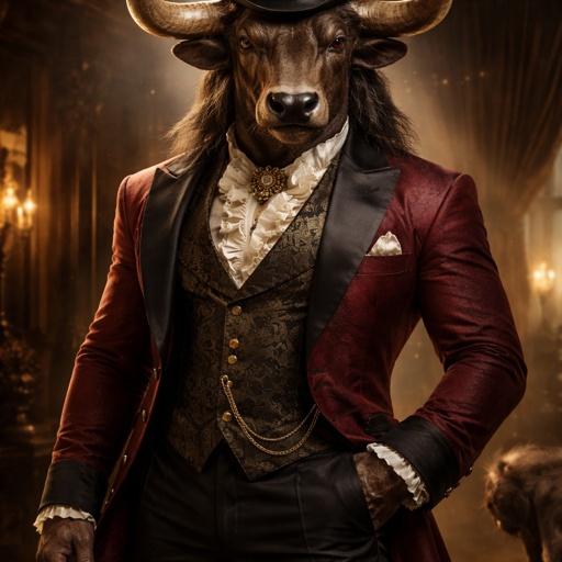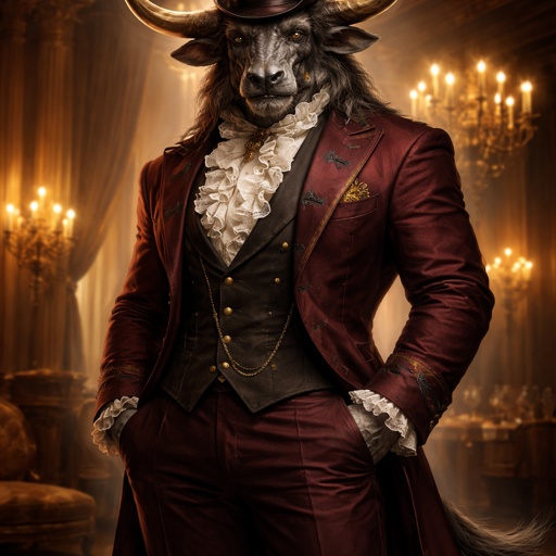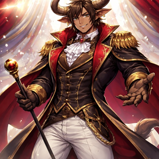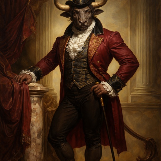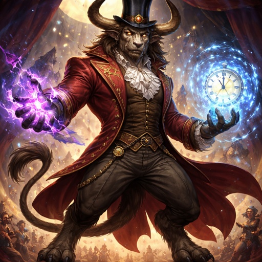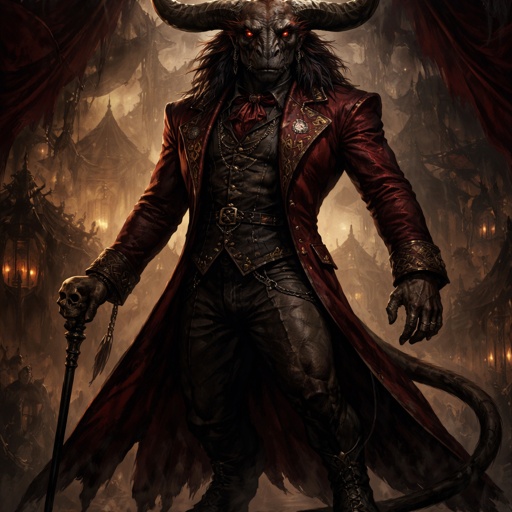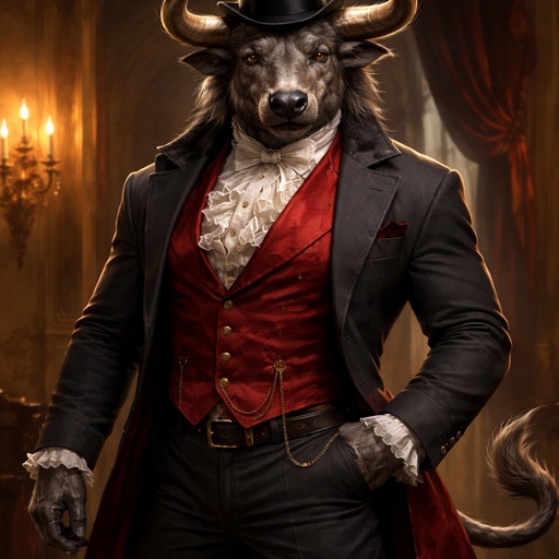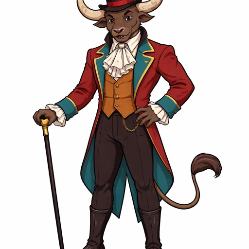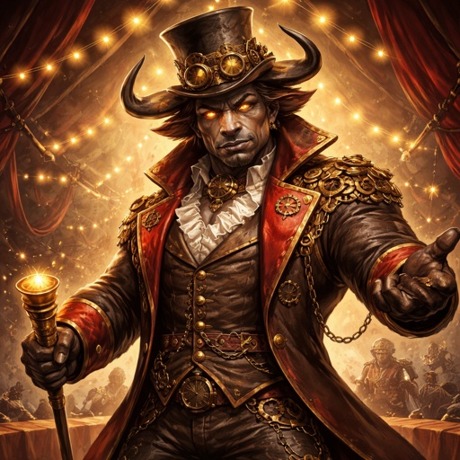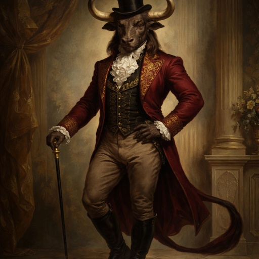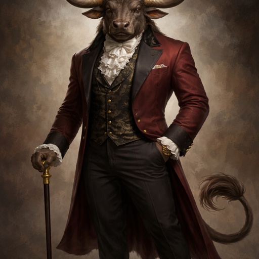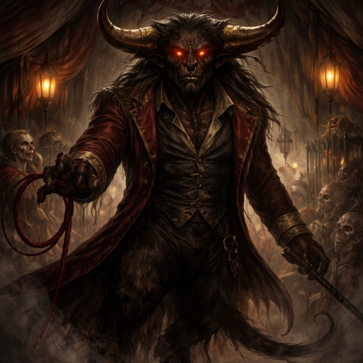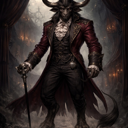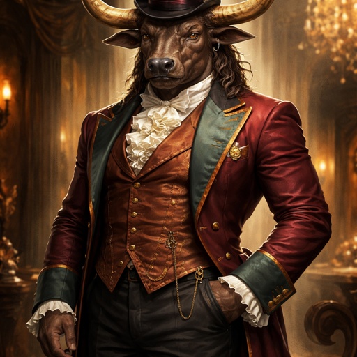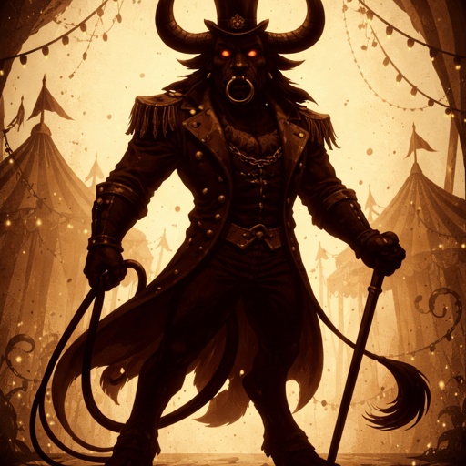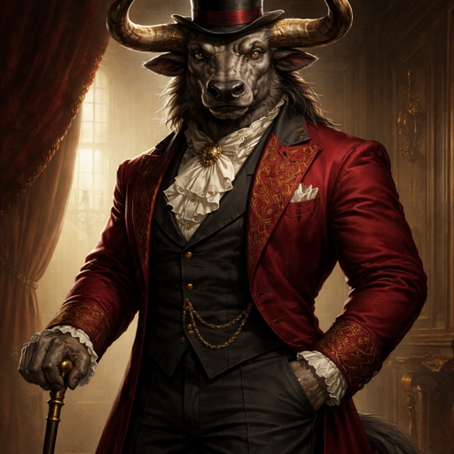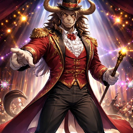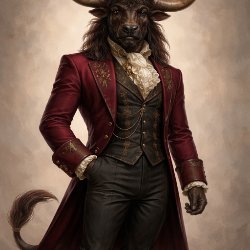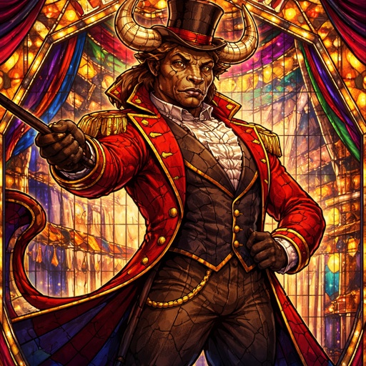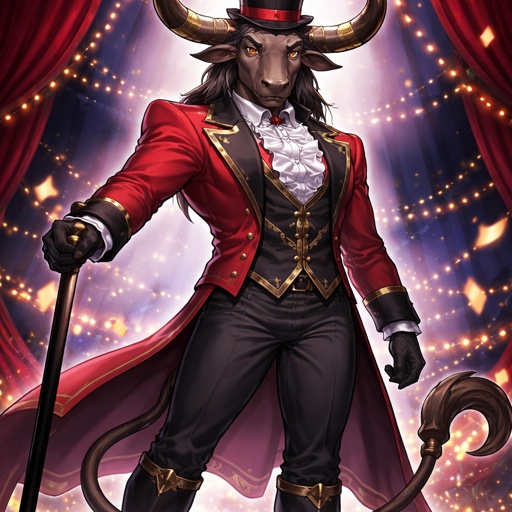 A medium brown Steppe bull Minotaur with a well~proportioned figure that works at freak show as ringmaster. That has gif...