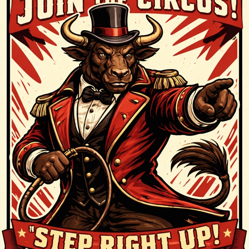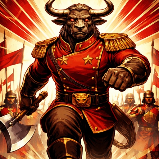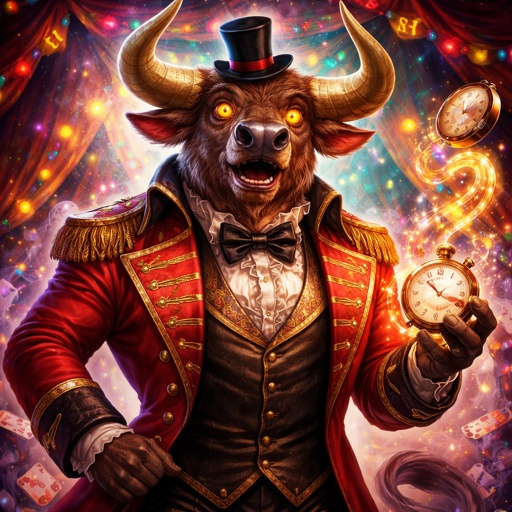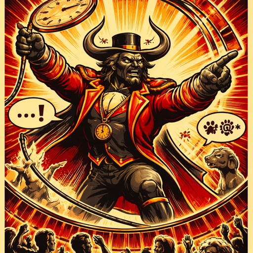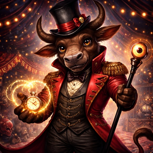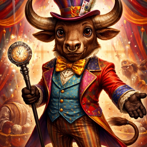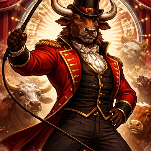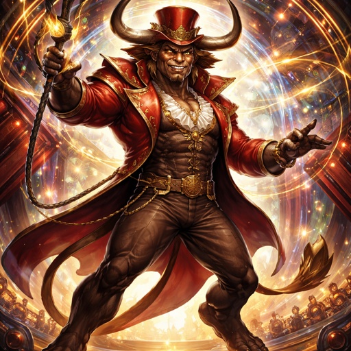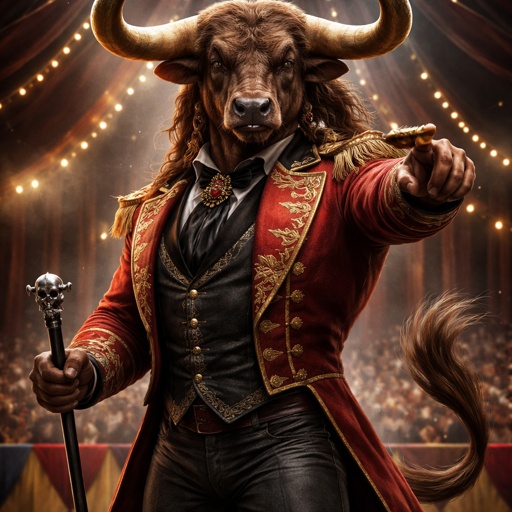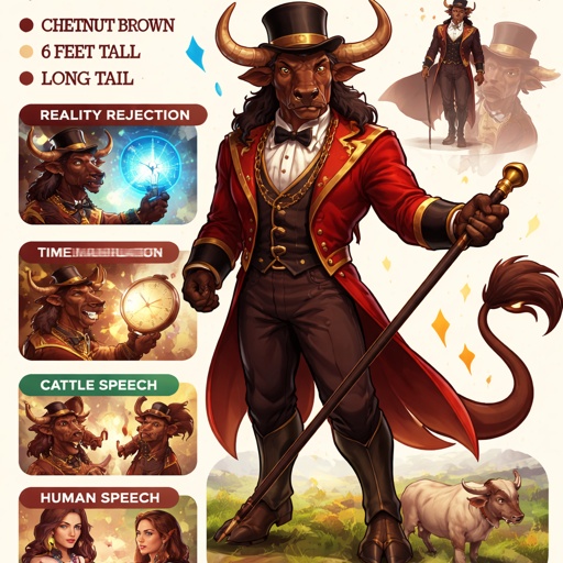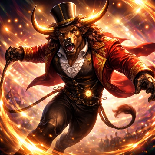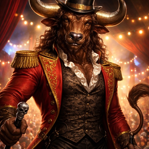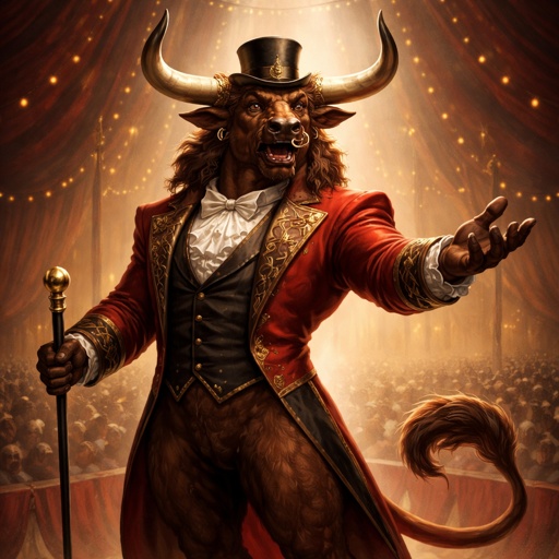 A brown Steppe bull Minotaur with a well~proportioned figure that works at freak show as ringmaster. That has gifts/abil...