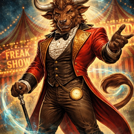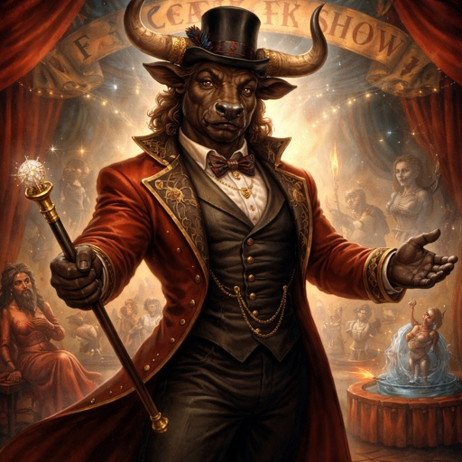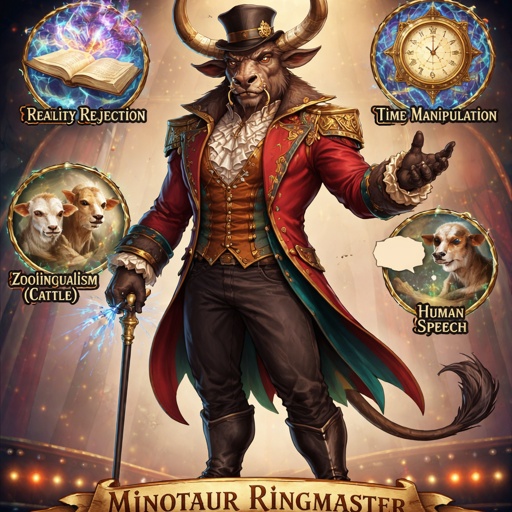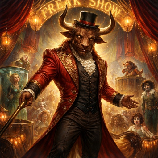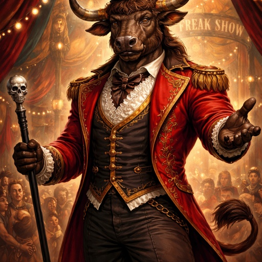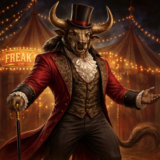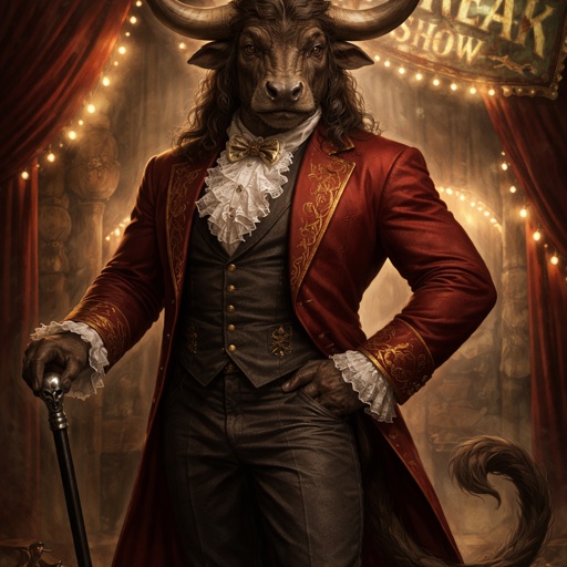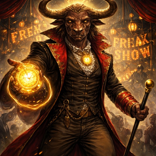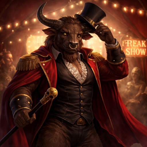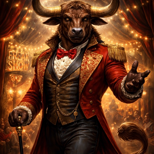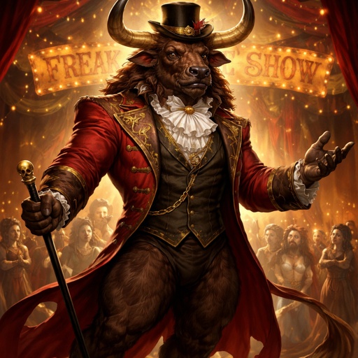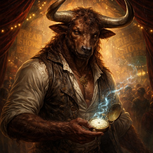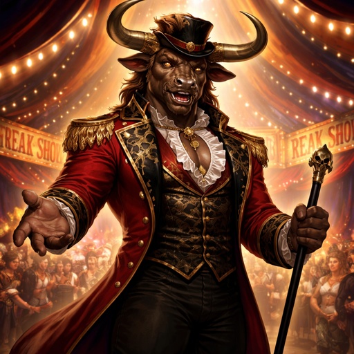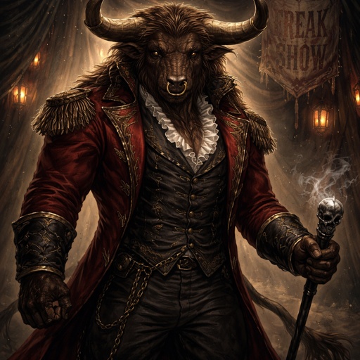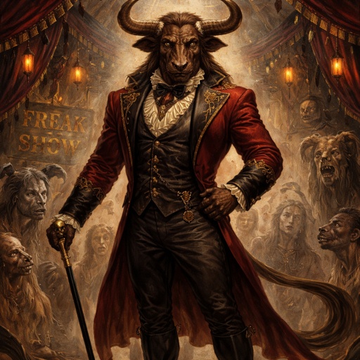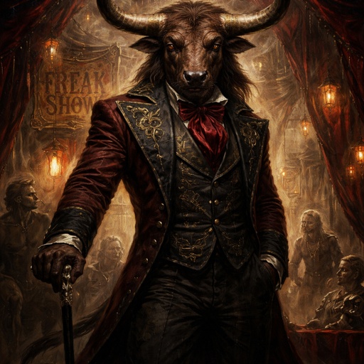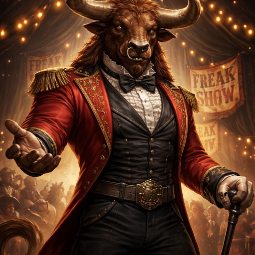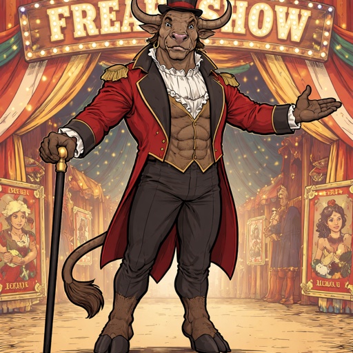 A Minotaur with a well~proportioned figure that works at freak show as the ringmaster. That has gifts/abilities like Rea...