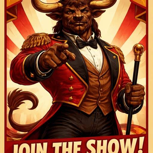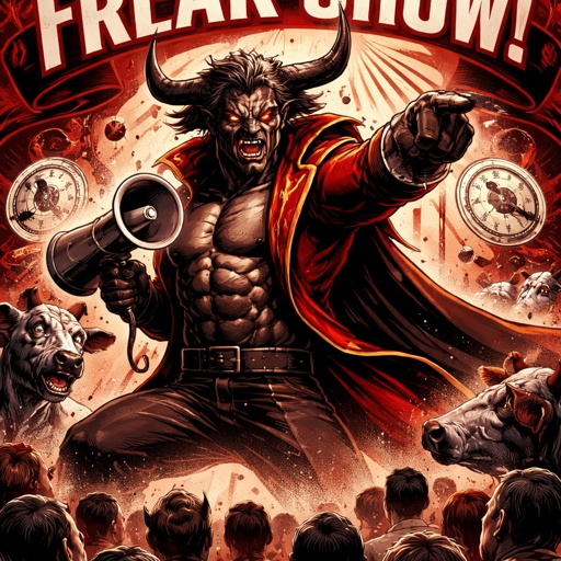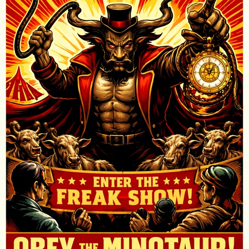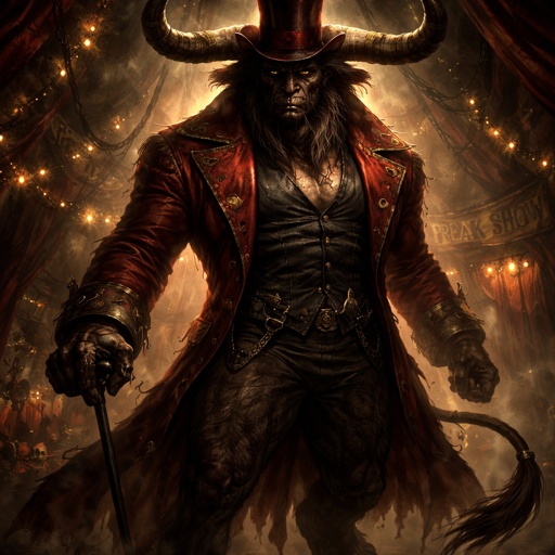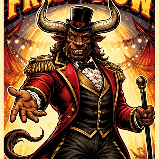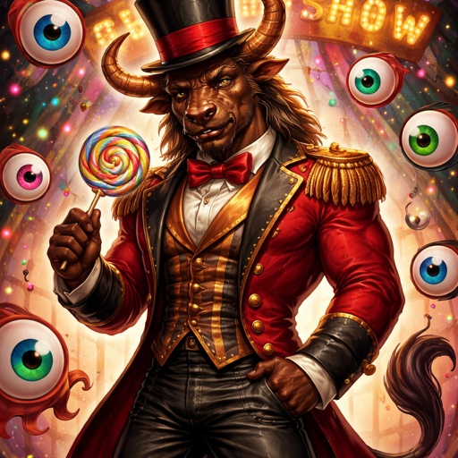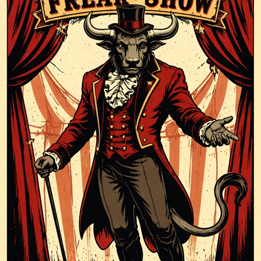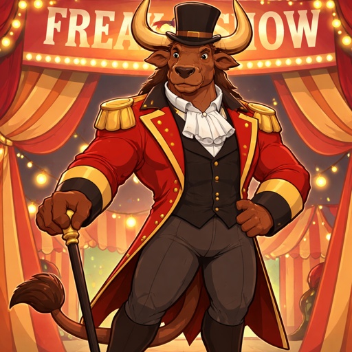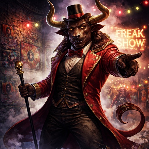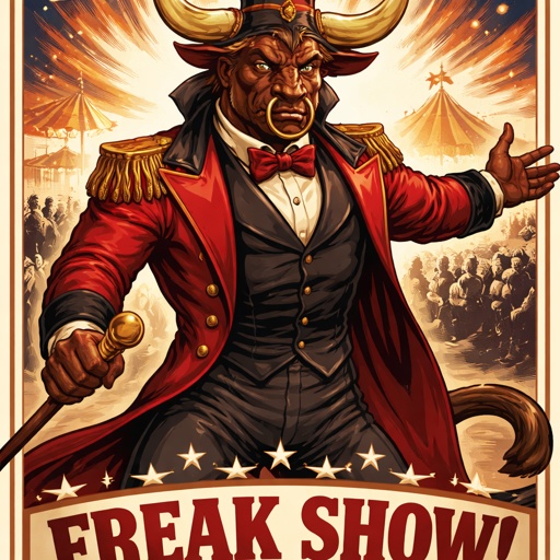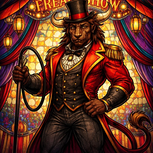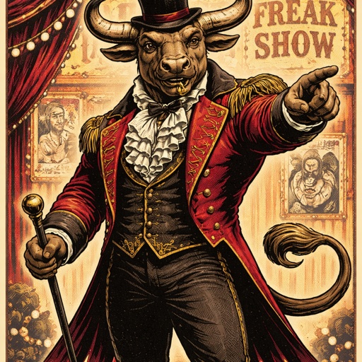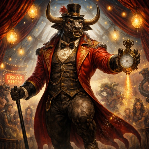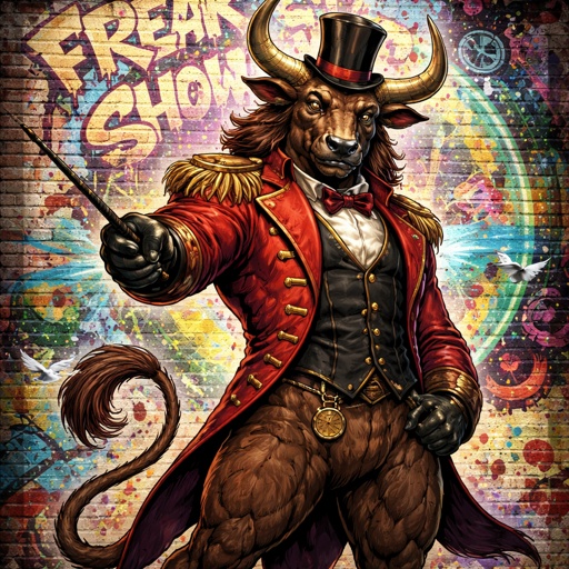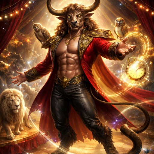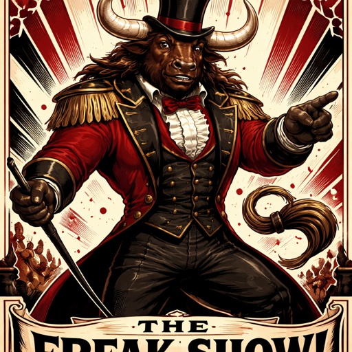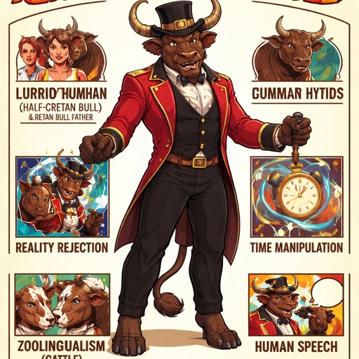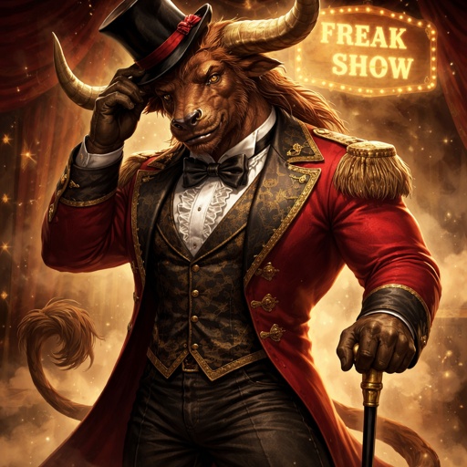 A Minotaur with a well~proportioned figure that works at freak show as the ringmaster. That has gifts/abilities like Rea...