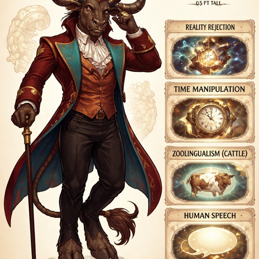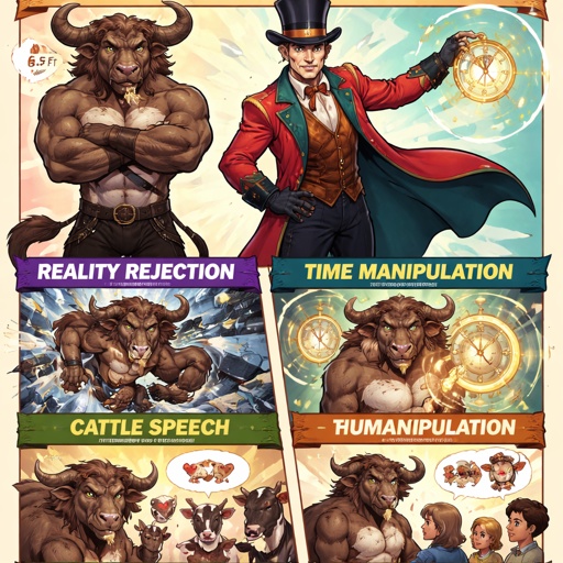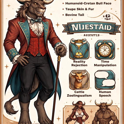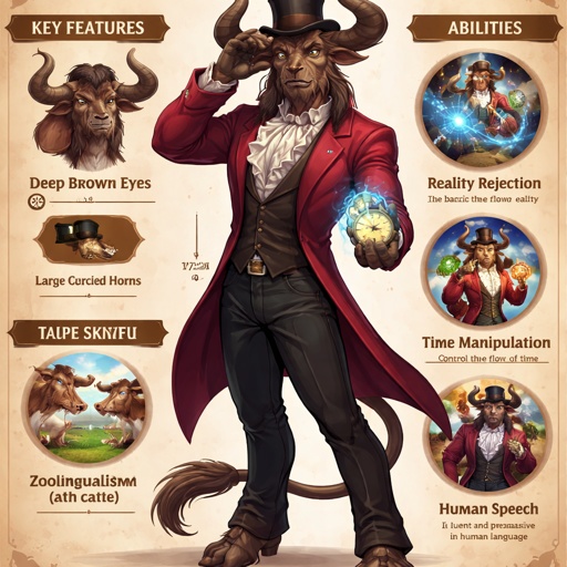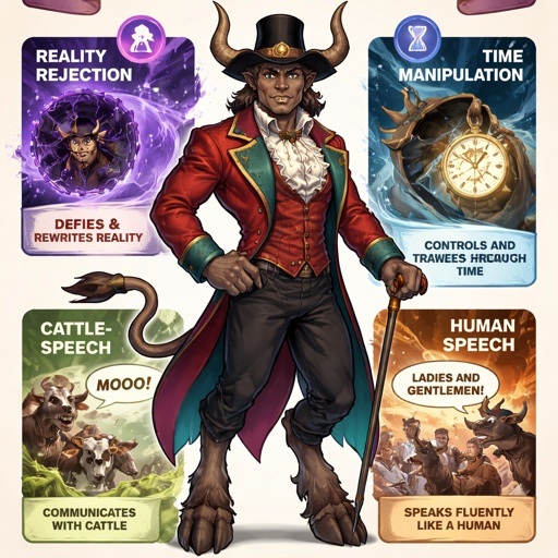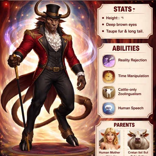 Minotaur with a well~proportioned figure and abilities like Reality Rejection, Time Manipulation (Chronokineses), Zoolin...