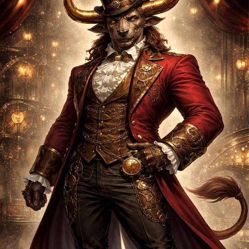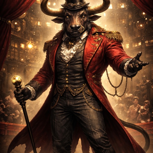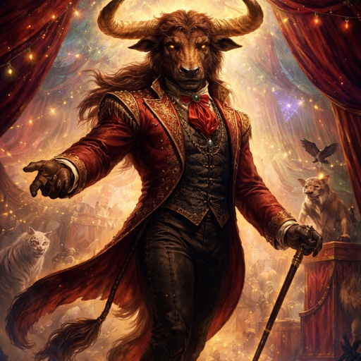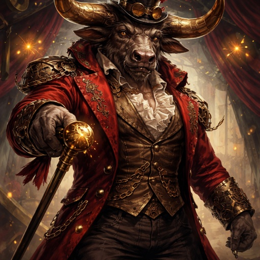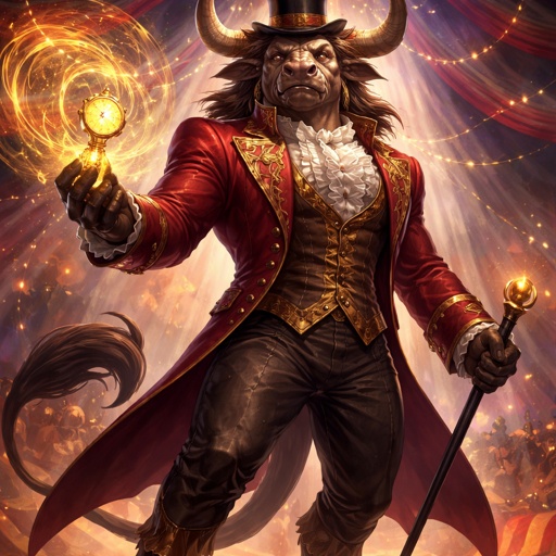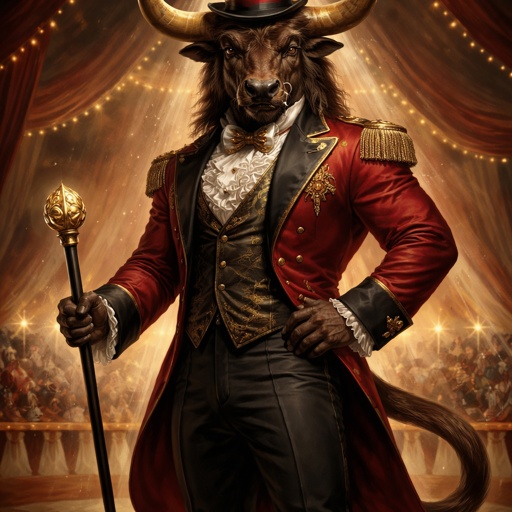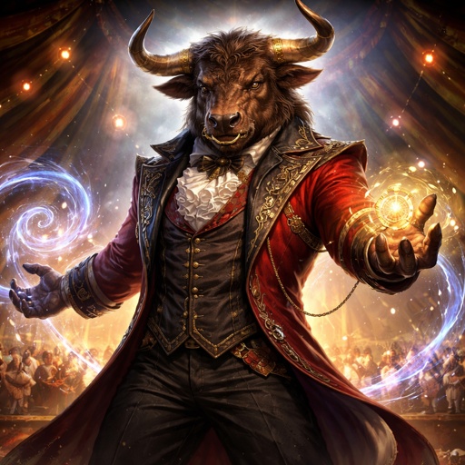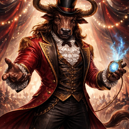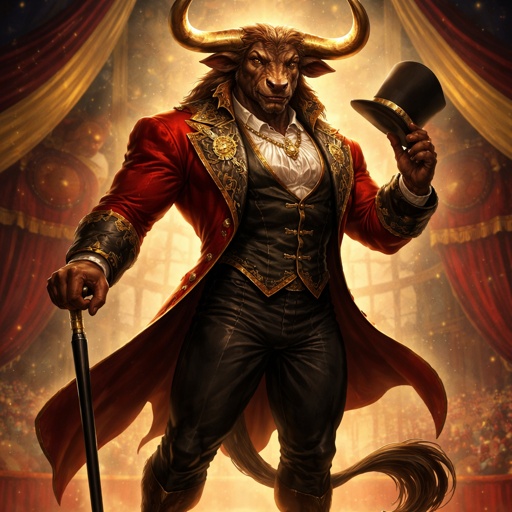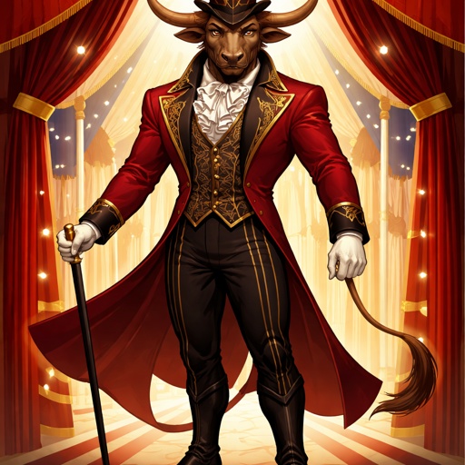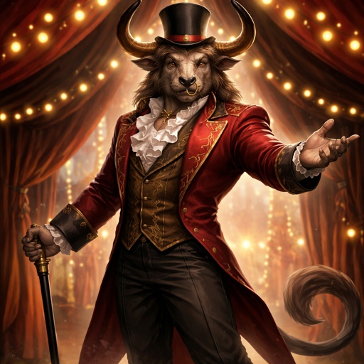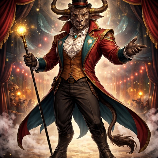 A light brown Steppe bull Minotaur with a well~proportioned figure that works at freak show as ringmaster. That has gift...