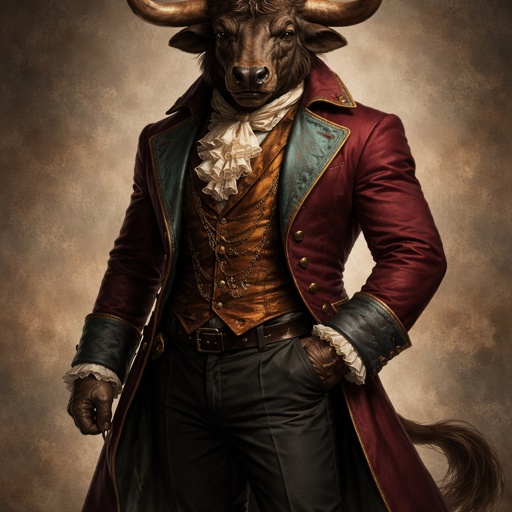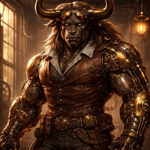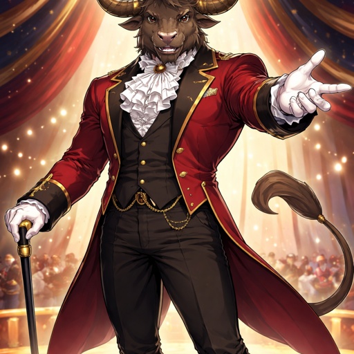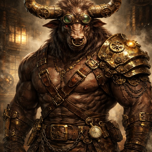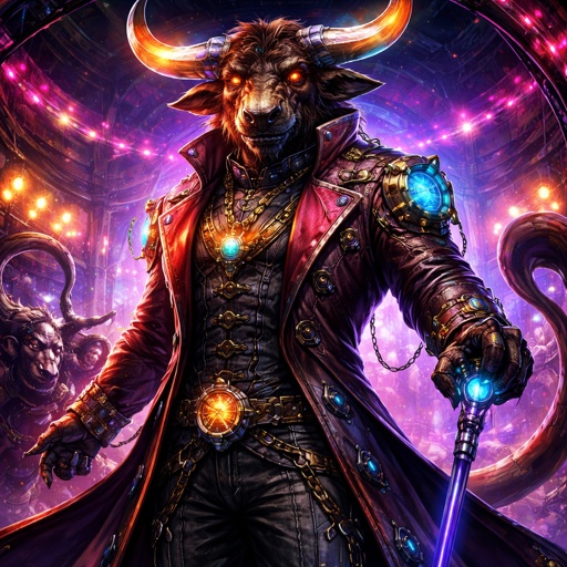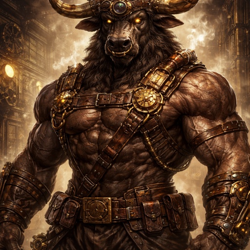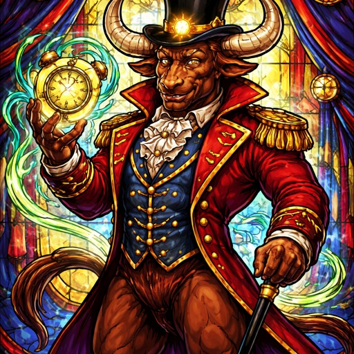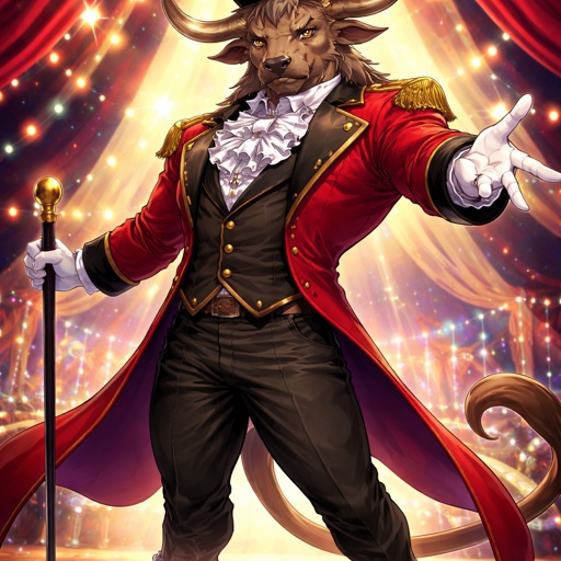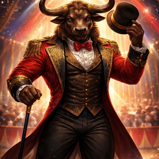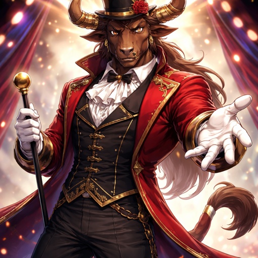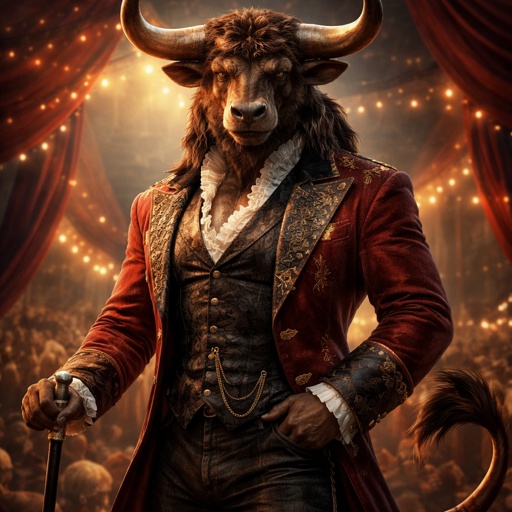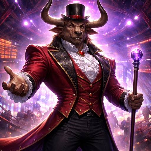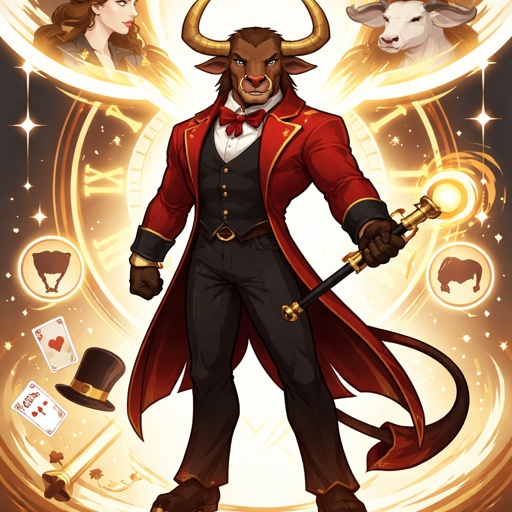 A light brown Steppe bull Minotaur with a well~proportioned figure that works at freak show as ringmaster. That has gift...