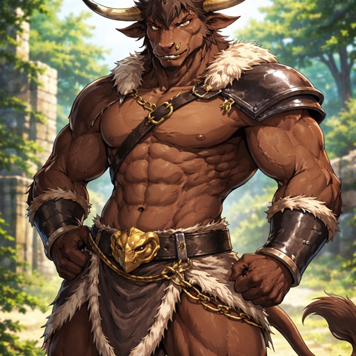 A male chestnut brown Minotaur with deep set cattle like brown eyes, large powerful gleaming horns like his fathers, a w...