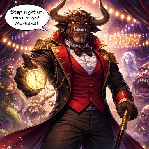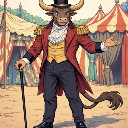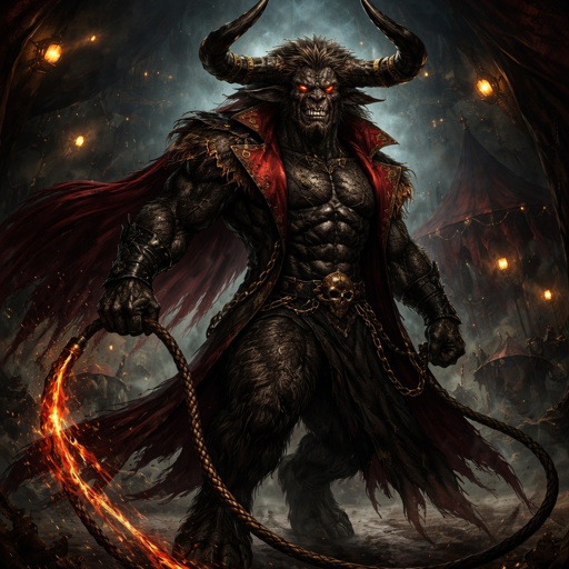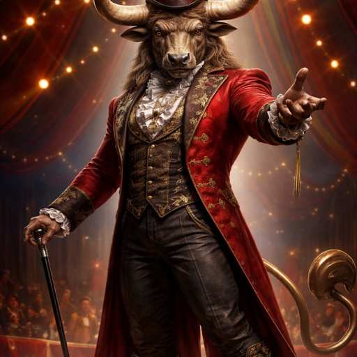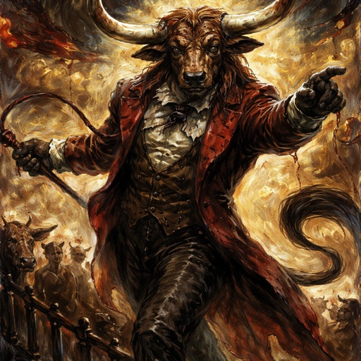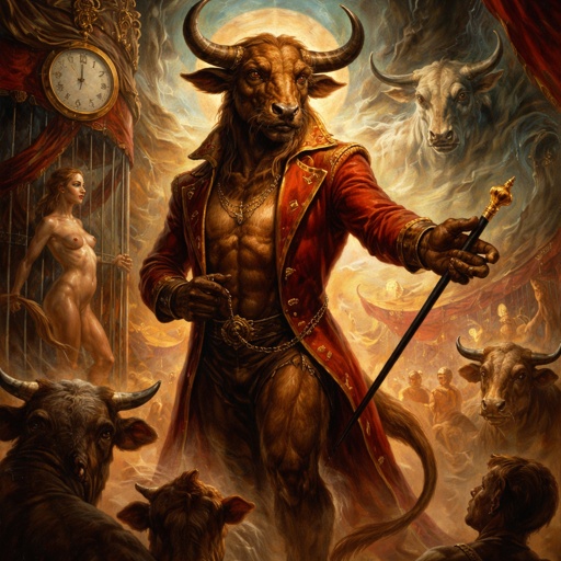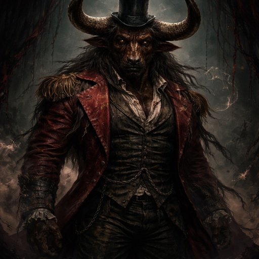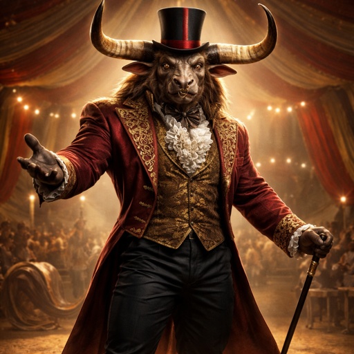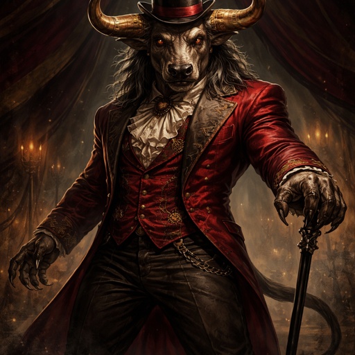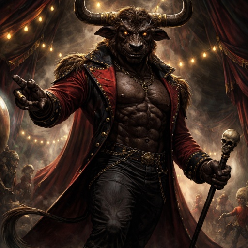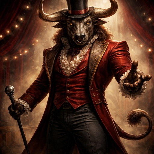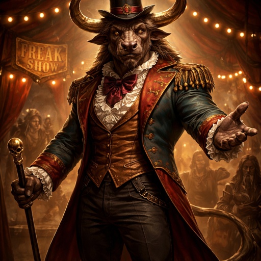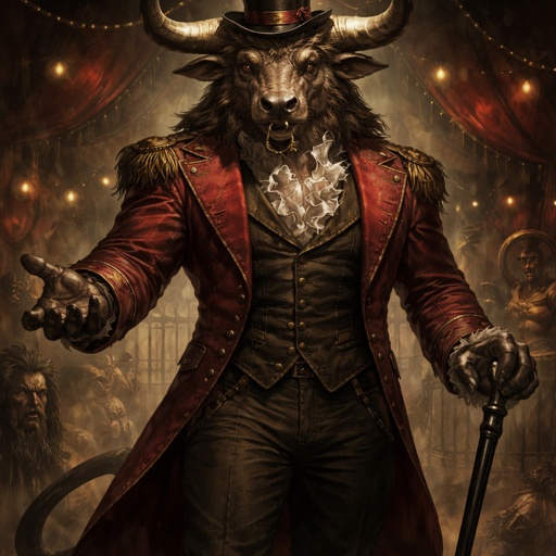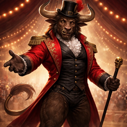 A Greta bull Minotaur with a well~proportioned figure that works at freak show as ringmaster. That has gifts/abilities l...