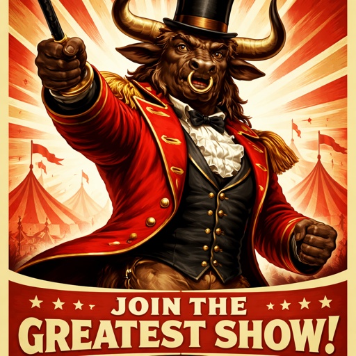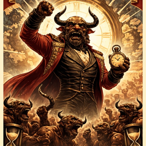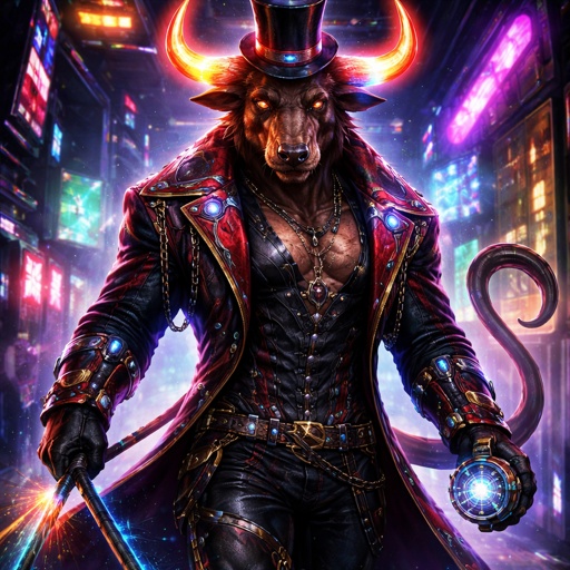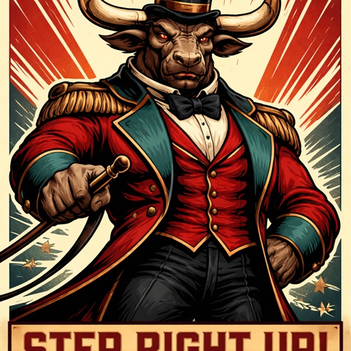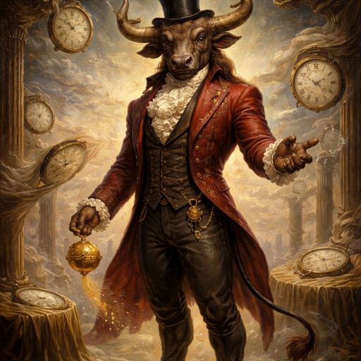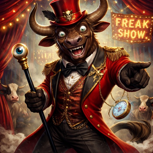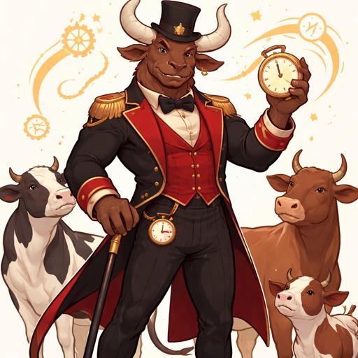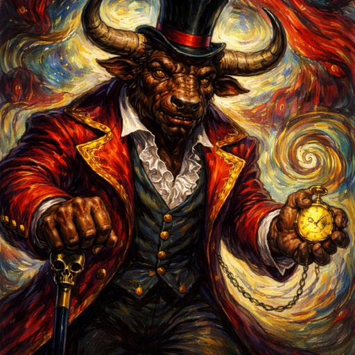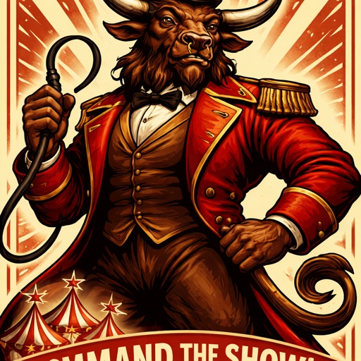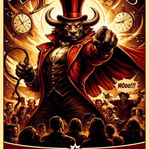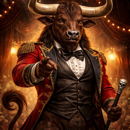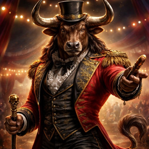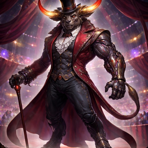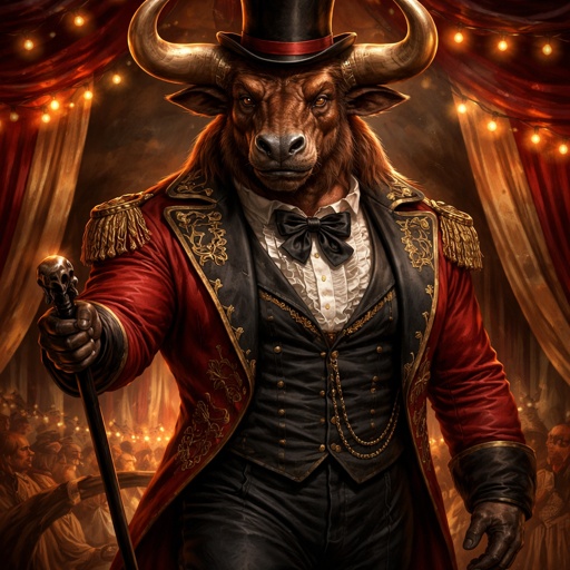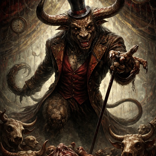 A Greta bull Minotaur with a well~proportioned figure that works at freak show as ringmaster. That has gifts/abilities l...