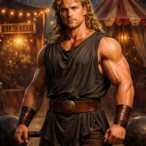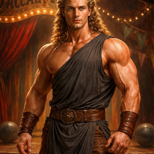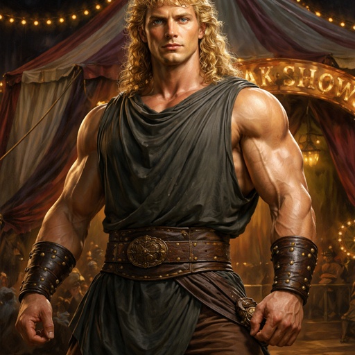 A medium brown Greek Minotaur with a well~proportioned figure that works at freak show as ringmaster. That has gifts/abi...