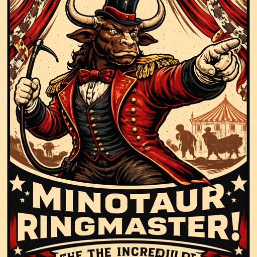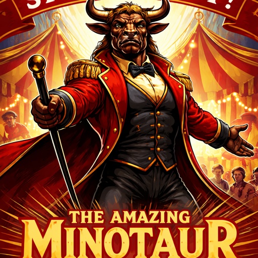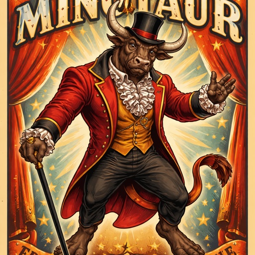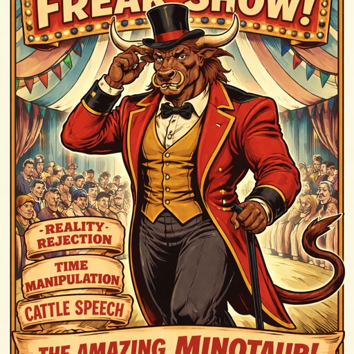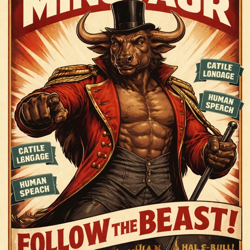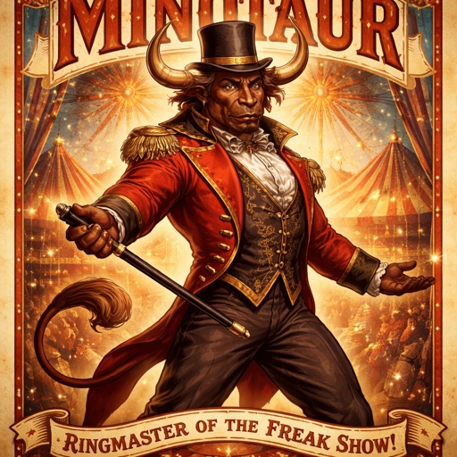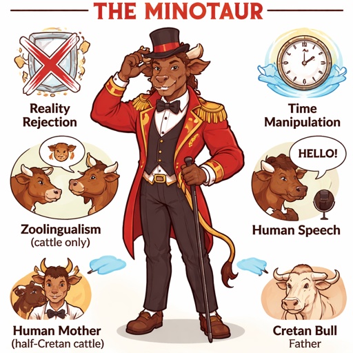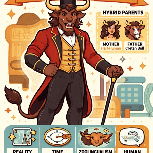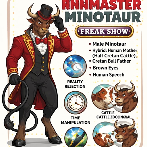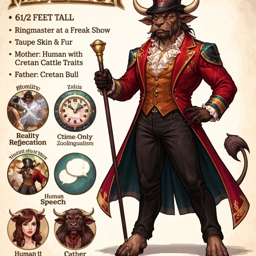 A Gretan bull Minotaur with a well~proportioned figure that works at freak show as ringmaster. That has gifts/abilities ...