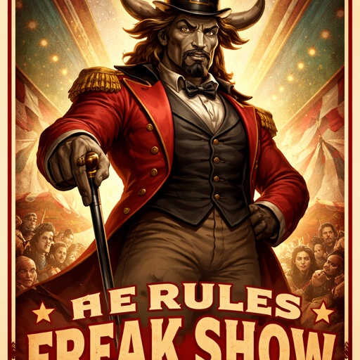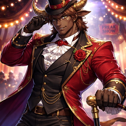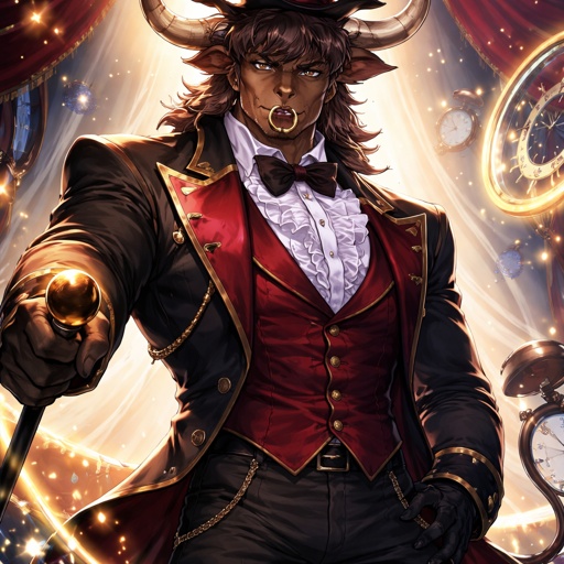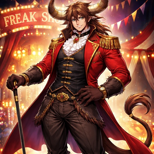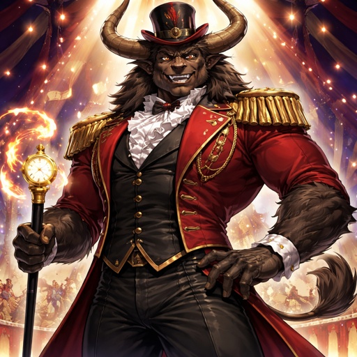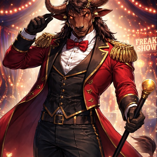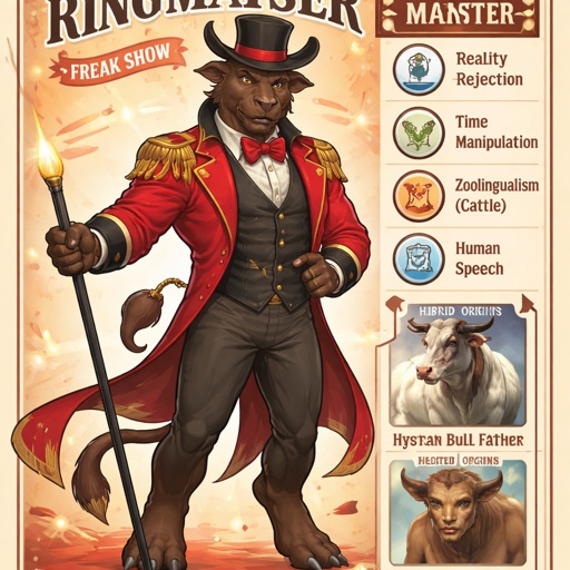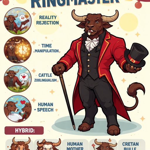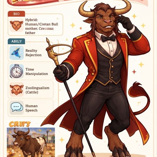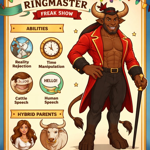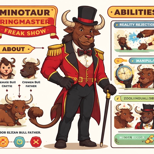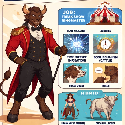 A male Minotaur that has a well~proportioned figure that works at freak show as the ringmaster. That has abilities of Re...