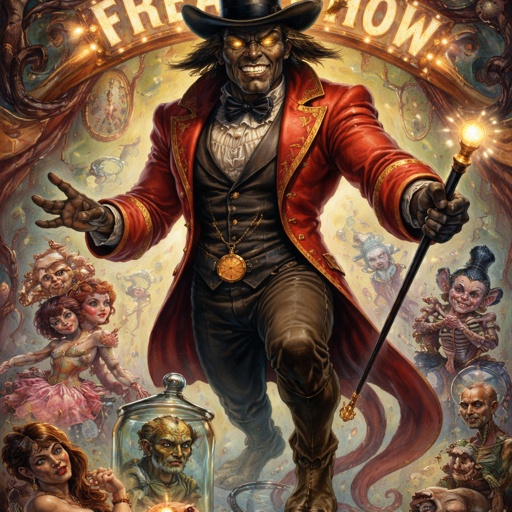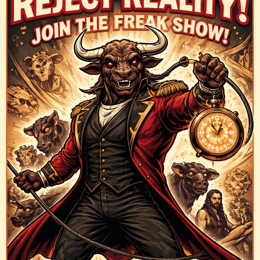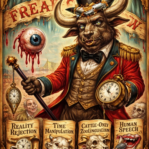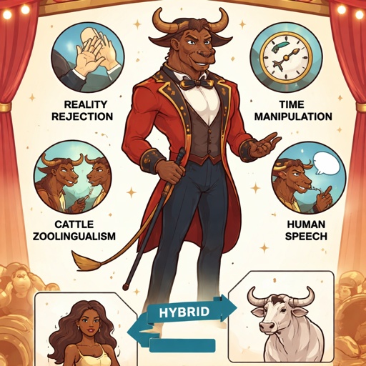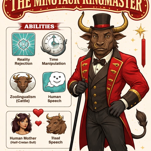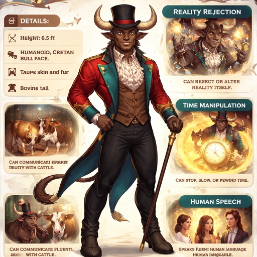 Minotaur with a well~proportioned figure that works at freak show as ringmaster. That has gifts/abilities like Reality R...