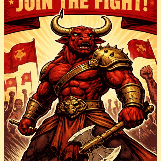 A male Minotaur that’s 6 1/2 feet tall. He has a humanoid-Cretan bull smooched face with deep set bovine brown eyes. On ...