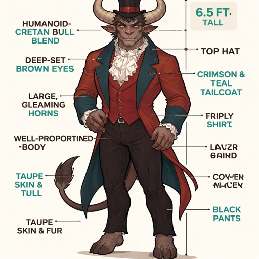 A male Minotaur that’s 6 1/2 feet tall. He has a humanoid-Cretan bull face with deep set bovine like brown eyes. On his ...