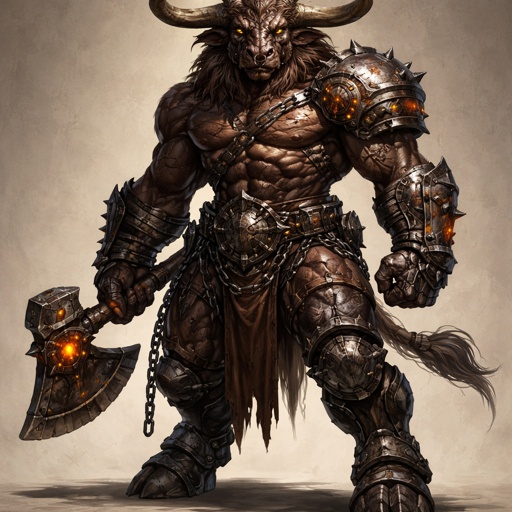 A male Minotaur that’s 6 1/2 feet tall and His Key Features are. His head looks like a mixture between Cretan bull and a...