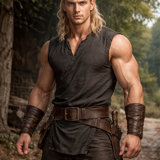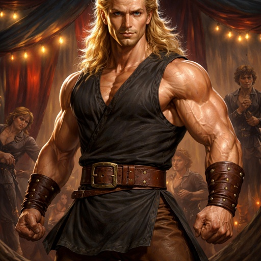 A tall well~proportioned muscular figure/body giving an impression of sheer power”. His haircut is a blonde mullet. His ...