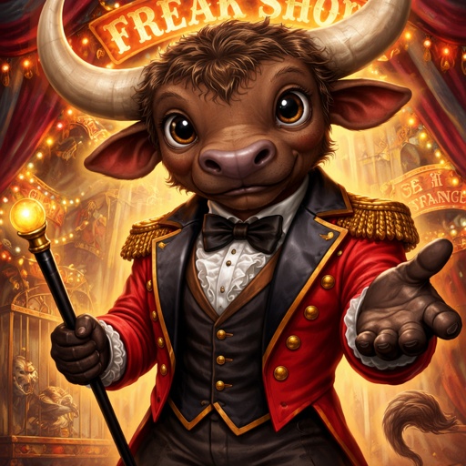 A medium brown Minotaur with a well~proportioned figure that works at freak show as ringmaster. That has gifts/abilities...