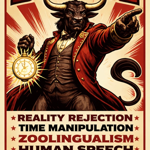 A Steppe bull Minotaur with a well~proportioned figure that works at freak show as ringmaster. That has gifts/abilities ...