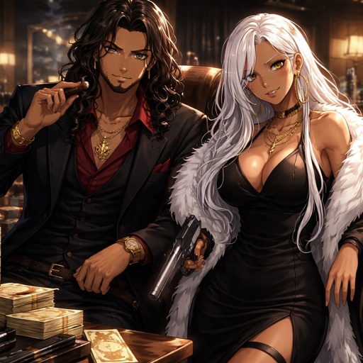 A mafia organization with a man with Egyptian skin, long curly hair, with his ally who is female, Egyptian skin, and lon...