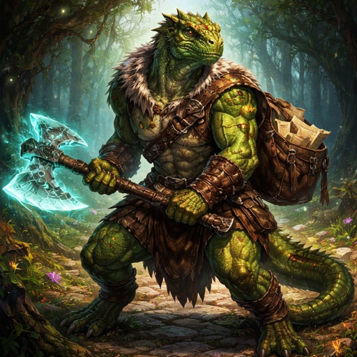 Green lizard folk male barbarian postal worker with a scar above his left eye and a small bite mark on his tail