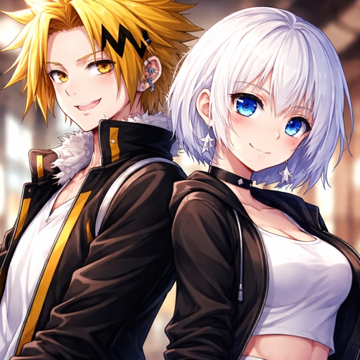 Denki kamanari and a girl with short white hair, doesn’t where female uniform, royal blue eyes with white star shaped pu...